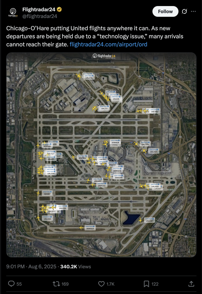 Much of O’Hare, including its four terminals and the bulk of its eight runways, are located within Illinois’s Fifth Congressional District. Incoming planes typically taxi to those terminals. But “technical issues” impacting United Airlines on Wednesday forced the airport to hold departures, creating a backlog that prevented incoming planes from reaching their gates. As a result, a map from live flight tracker Flightradar24 shows O’Hare began parking incoming United flights on the airport’s northern end, which is located within the fifth district, as well as its western end, which is located within the neighboring third district.